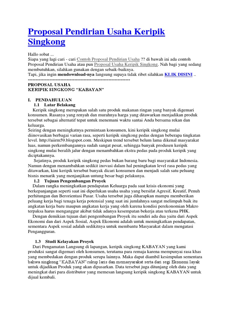 Singkong atau ketela mungkin sudah banyak masyarakat mengetahui tumbuhan yang satu ini. Contoh proposal keripik singkong (kwu) posted by jelajah internet , add , add comment in contoh proposal on proposal on thursday, november 06, 2014. Proposal usaha keripik singkong kabayan i. Contoh proposal usaha kripik pisang. Contoh proposal kerupuk singkong memang selalu dibutuhkan ketika kita ingin mendirikan suatu usaha.